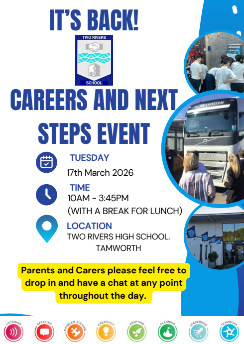 Two Rivers High School is committed to enabling all students, regardless of ability, to make well informed, realistic and ambitious decisions about future learning and careers pathways. The school strives to raise learners’ aspirations, enabling them to investigate a broad spectrum of potential opportunities. The school’s curriculum is designed to focus on the development of social and communication skills that promote the growth of practical employability skills. (GBM1)