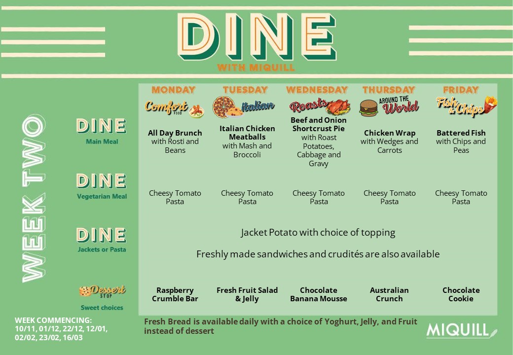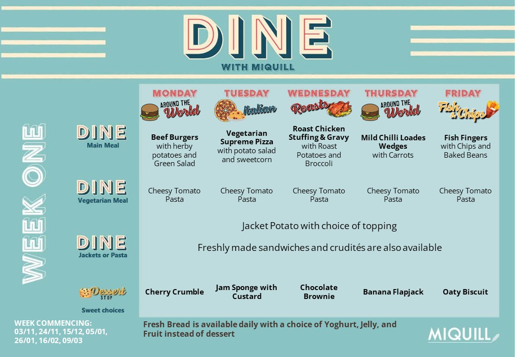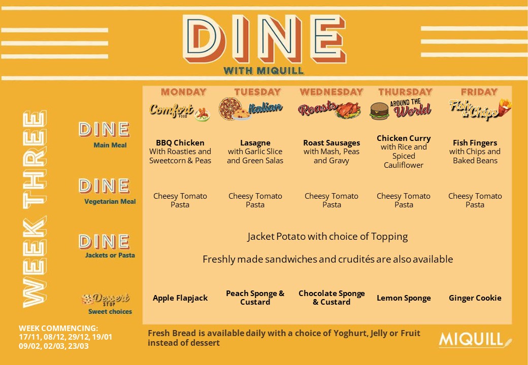 Our catering provider is Miquill. Below you will find our new menus and information about the company and their allergy policy below.